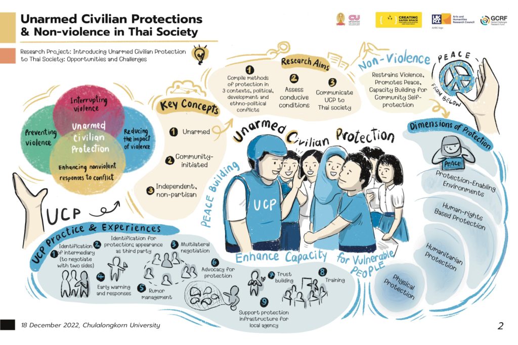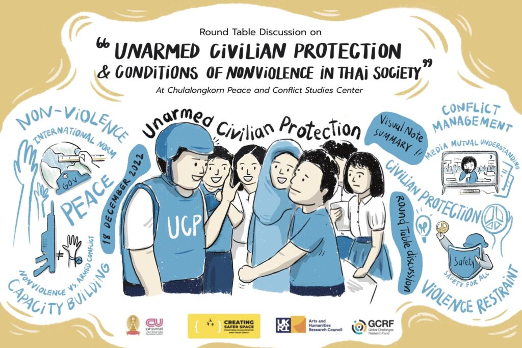 A visual note summary of the roundtable discussion “Unarmed Civilian Protection and Conditions of Nonviolence in Thai Society” at Chulalongkorn Peace and Conflict Studies Center, December 2022. Illustrated by Wanwisa Intarakanchit.